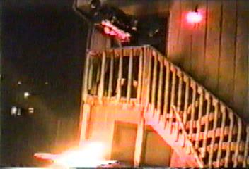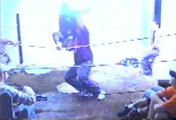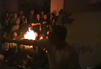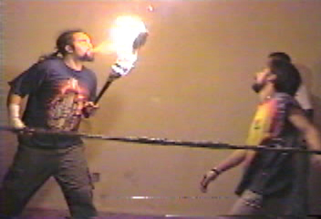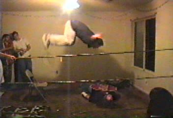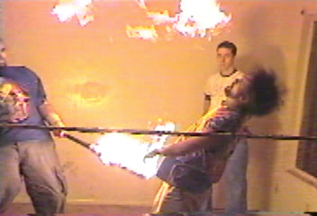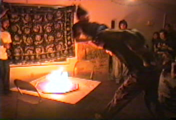 Jaz E. Dangerously kicks the towel on fans in the front row. The couch and fans catch on fire inside the 2nd story Apt.