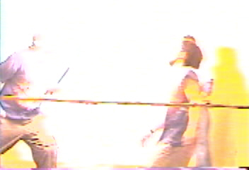 Andy powerbombing jaz off the high deck through a table on fire! Jaz lands right on his head, breaks 2 ribs, and suffers a concussion!